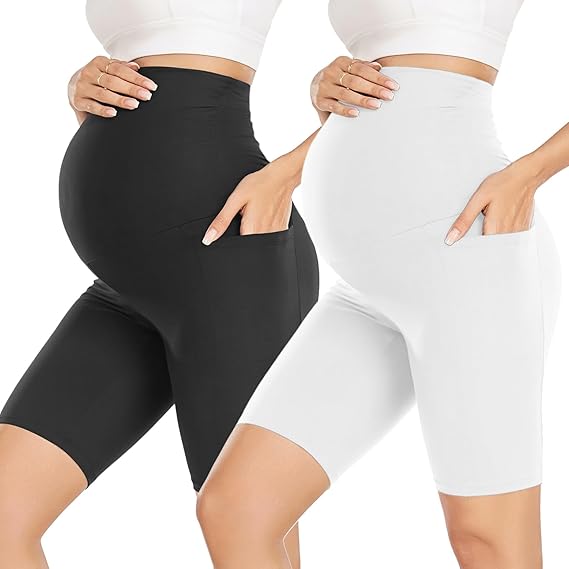 Maternity Shorts Over Belly- Pregnancy Biker Shorts with Pockets Active Athletic Yoga Short Pants Summer Clothes