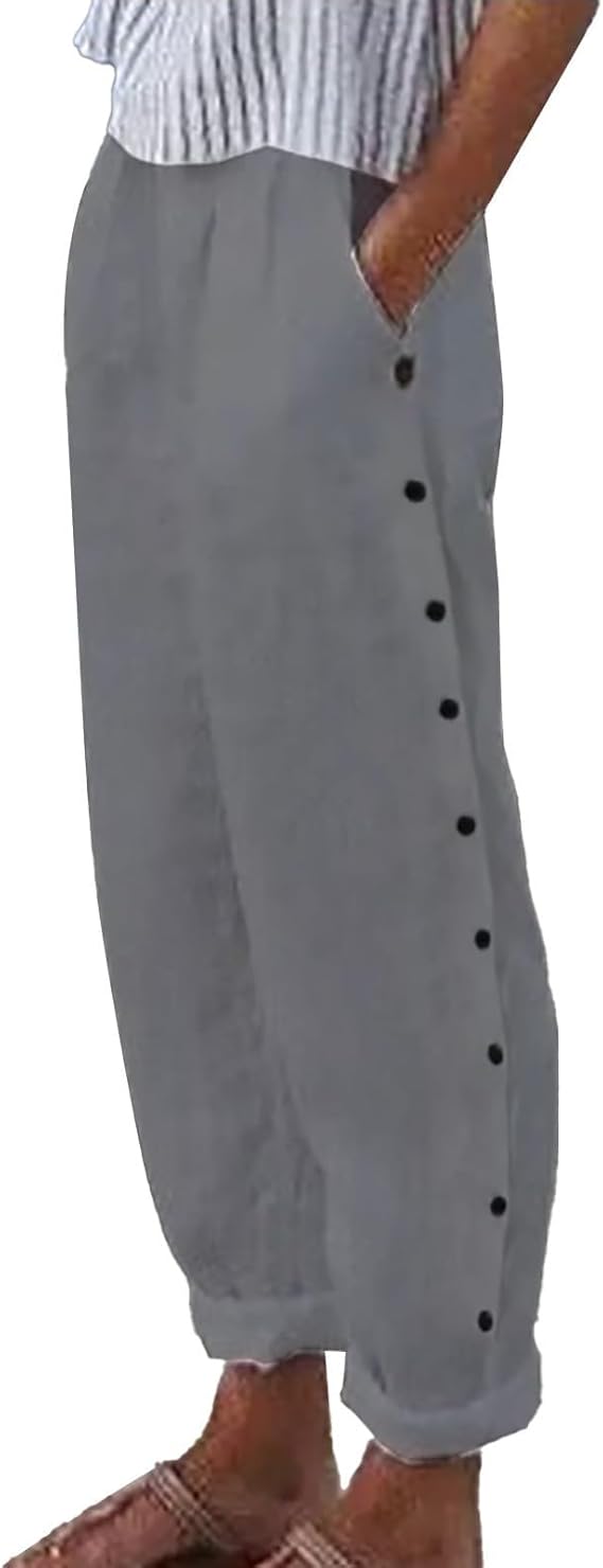 Summer Pants for Women,Casual Pants Stripe Print Side Button Trendy Pants Baggy Elastic Waist Straight Leg Comfy Trousers