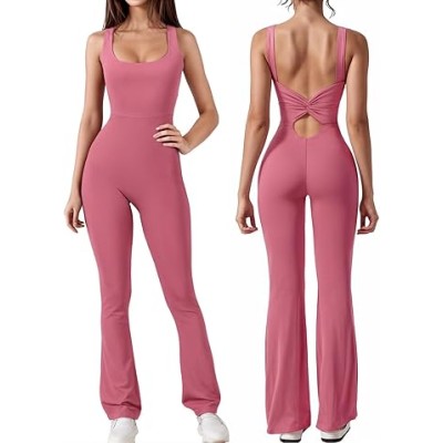 Women's Yoga Flare Jumpsuits Strappy Square Neck Backless Cutout One Piece Workout Bodycon Unitard