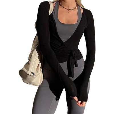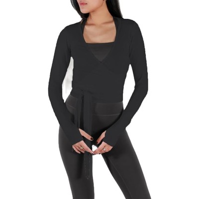 Womens Wrap Top Cross Tie Front Workout Long Sleeve Yoga Shirt with Thumb Holes