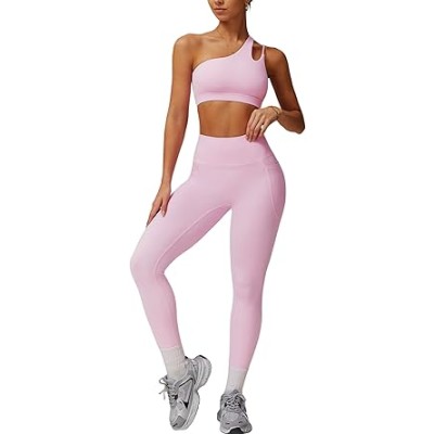 Women Workout Set Single Shoulder Straps Sports Bras and Leggings Set 2 Piece Gym Yoga Active Wear Outfit with Pockets