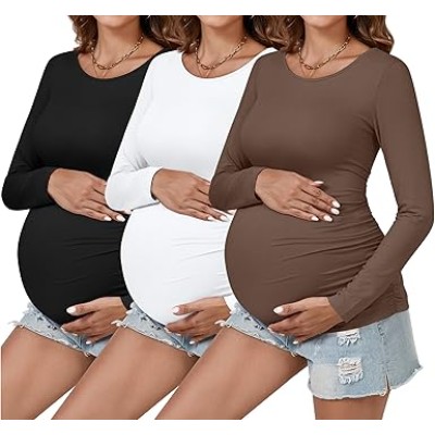 3 Pack Women's Maternity Shirts, Side Ruched Pregnancy Tee Tops Long Sleeve Basic Tunic Tshirt Casual Mama Clothes