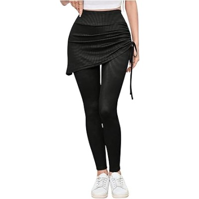 Women's 2 in 1 High Waisted Drawstring Side Ruched Skirted Leggings Slim Fit Workout Lounge Bottoms