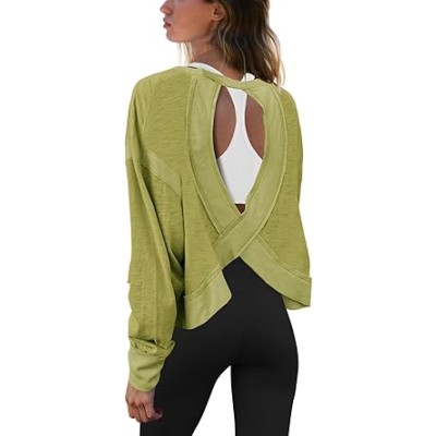 Womens Open Back Workout Top Long Sleeve Athletic Shirts Casual Crop Running Tee Y2k Yoga