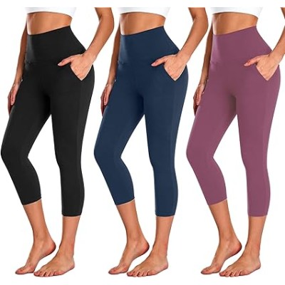 3 Pack Capri Leggings for Women with Pockets-High Waisted Tummy Control Workout Gym Yoga Pants