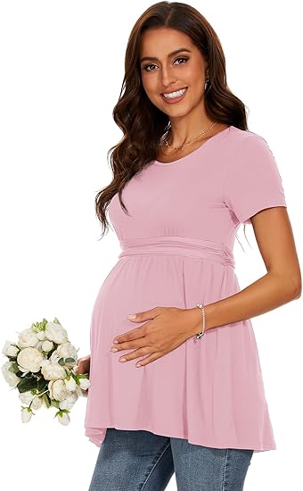 Women's Maternity Tops Short & Long Sleeve Pleated Waist Shirts Pregnancy Clothes
