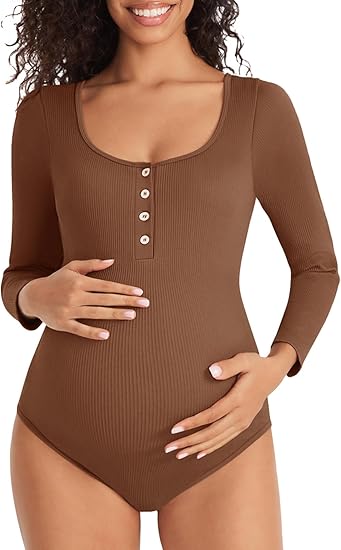 Maternity Bodysuit for Women Ribbed Pregnancy Romper One Piece Seamless Jumpsuit Long Sleeved Button Top Unitard