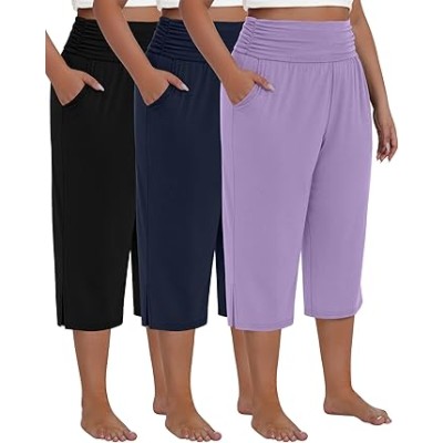 3 Pack Women's Plus Size Cotton Capri Pants High Waisted Wide Leg Loose Lounge Yoga Cropped Sweatpants with Pockets