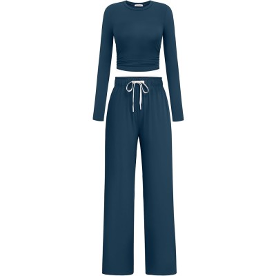 Women 2 Piece Lounge Set Long Sleeve Cropped Top Wide Leg Pants with Pockets 2024 Fall Outfits Matching Tracksuit