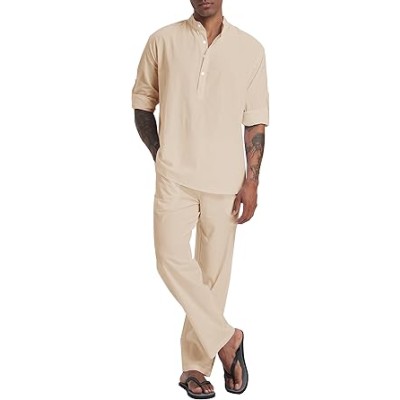 Men's Linen Sets Henley Shirts 2 Piece Vacation Outfits Beach Clothes Casual Suit Long Sleeve Shirt Yoga Pants Summer
