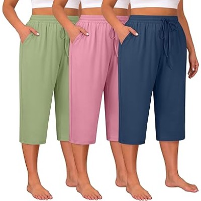 3 Pack Women's Plus Size Capris, Drawstring Cotton Yoga Capri Sweatpants Summer Casual Loose Cropped Pant with Pocket